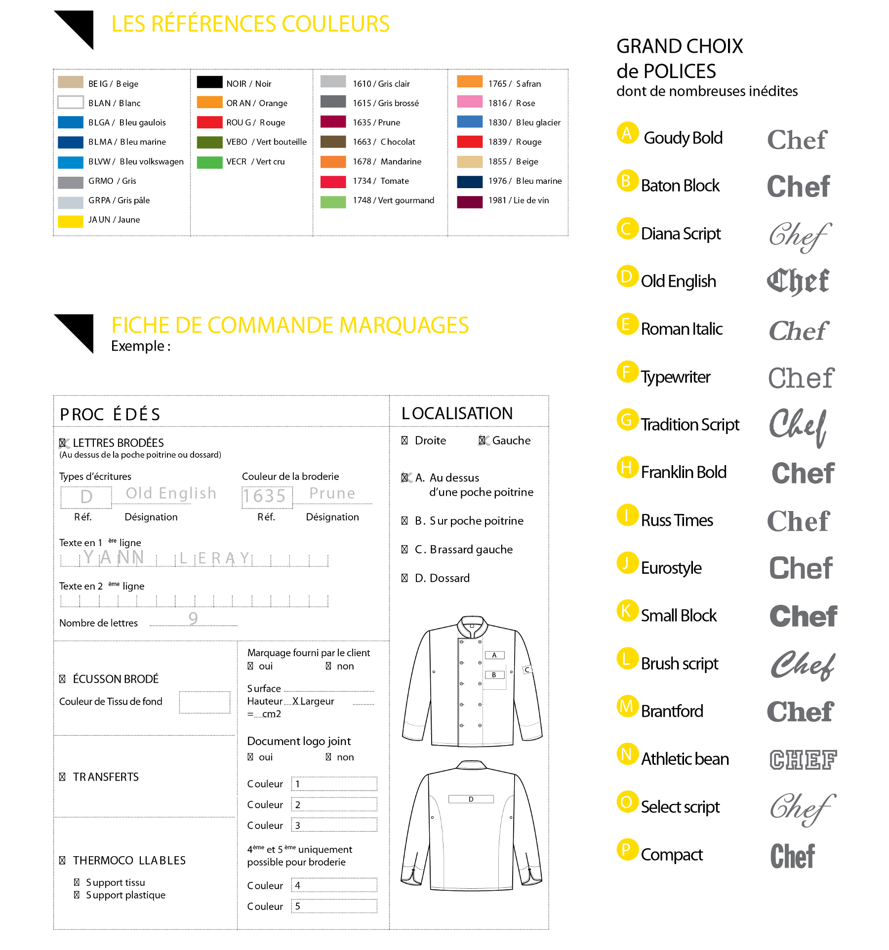 Un large choix de couleurs et de police pour personnaliser votre veste de cuisine aux couleurs de votre établissement.