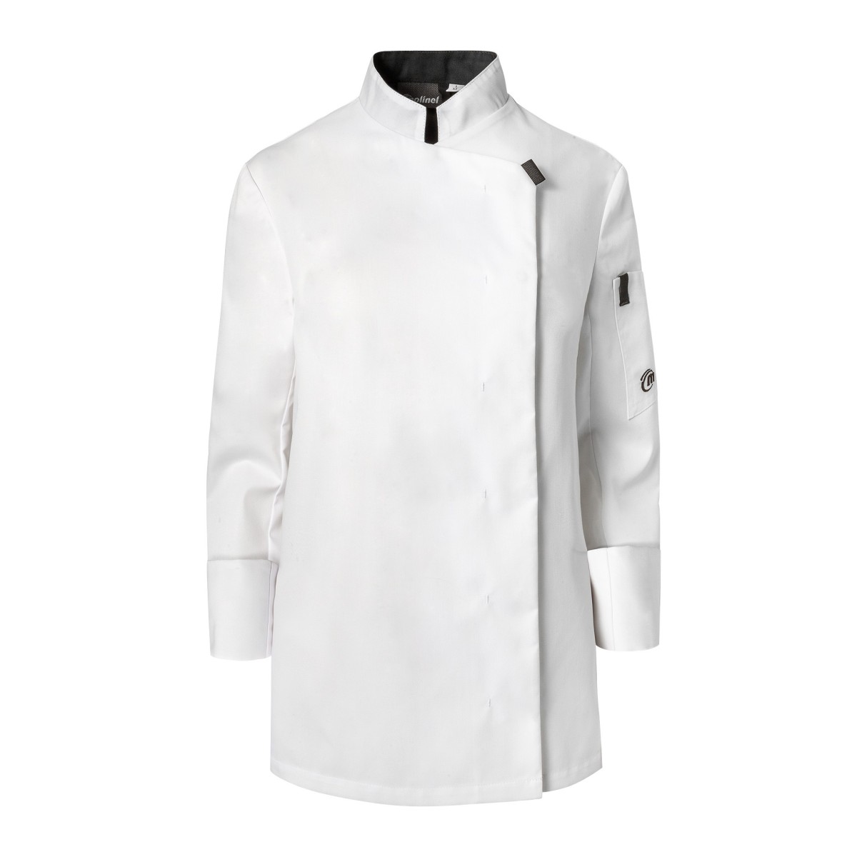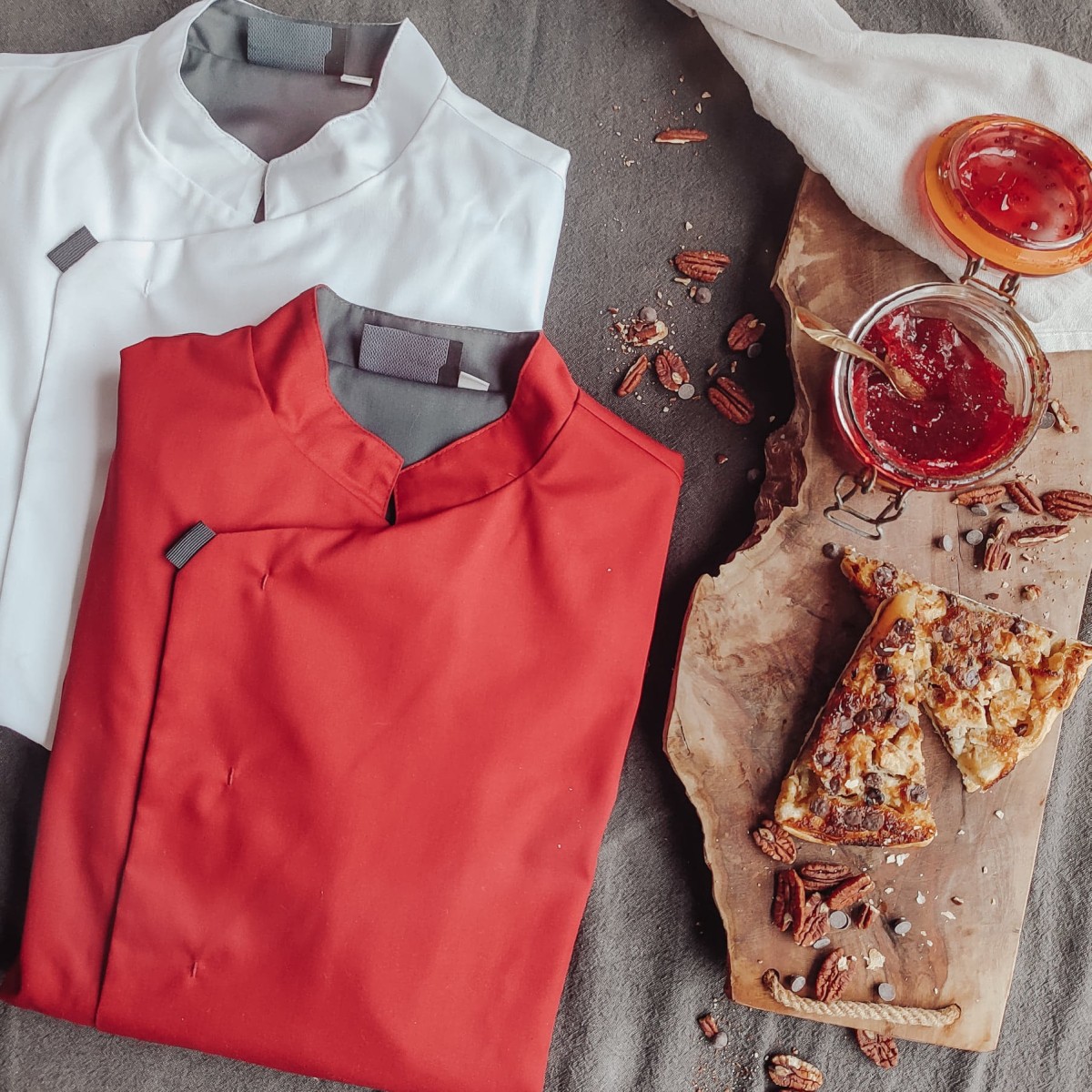 A contemporary women's kitchen jacket available in trendy and current colors - to combine with its masculine counterpart. Finishing details highlighted by a touch of anthracite gray. Our Shade jackets and Dan and Nell apron can be worn in a monochrome or color block version.