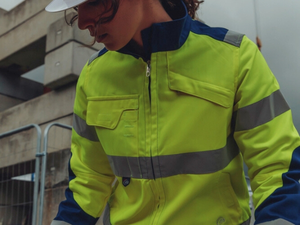 Le pantalon et le blouson arborent un tissu fluorescent, jaune ou orange, conjugué à des bandes rétroréfléchissantes cousues pour être visible quelles que soient les conditions climatiques. La couleur bleu marine est apposée en touches subtiles gage d’un style moderne. Ces vêtements protègent efficacement les professionnelles qui travaillent sur les voiries et réseaux autoroutiers, dans le bâtiment comme rippeuses, les travaux publics, les transports, l’entretien des espaces verts…